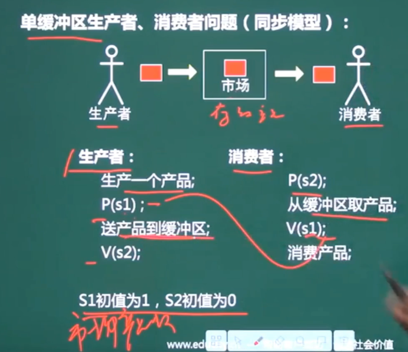 S=S-1,若S>=0,则进程继续执行;若S<0,则该进程置为等待状态,排入等待队列 - V操作:是一种释放资源的操作。